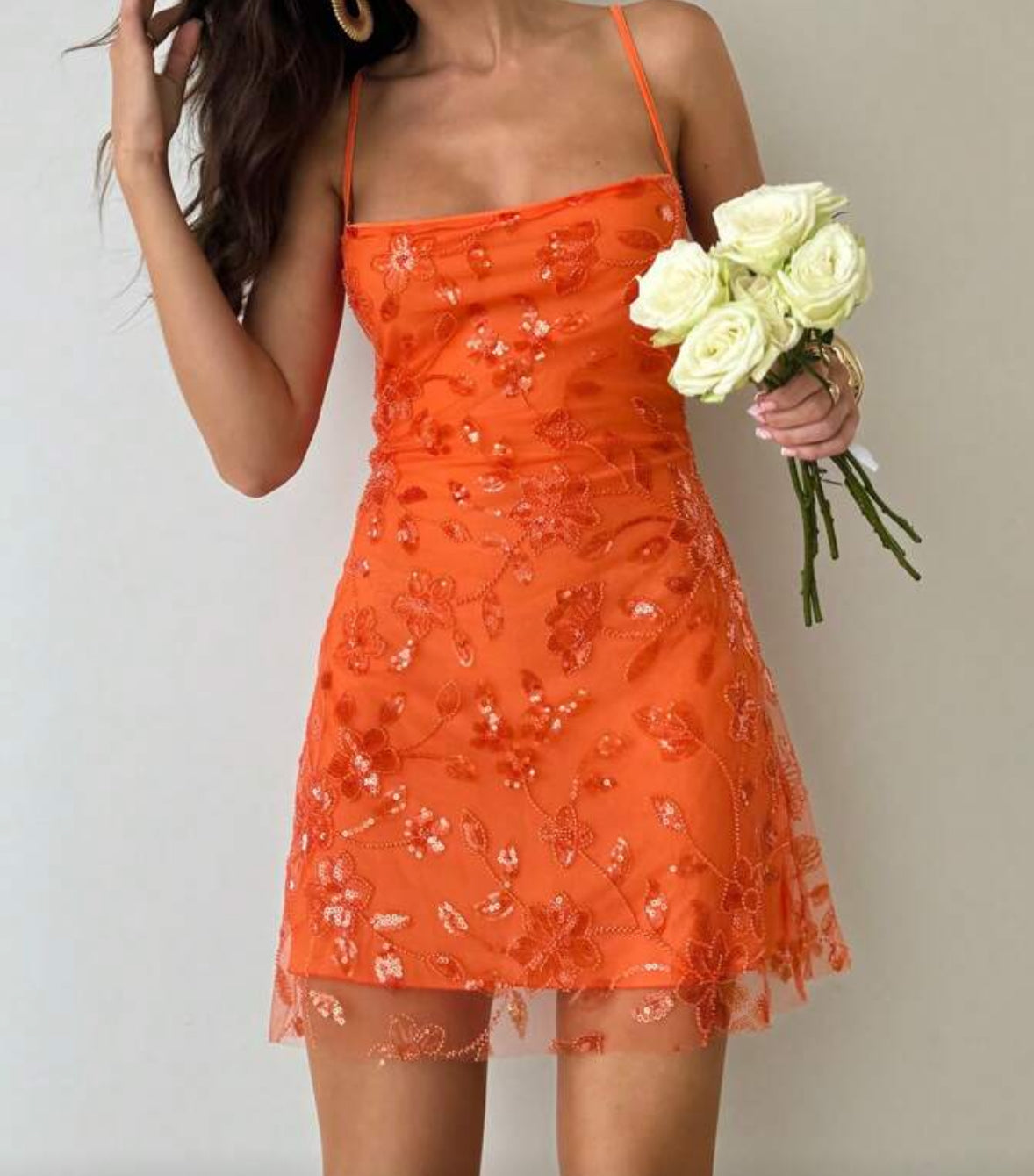 This Alani embellished mini dress features a stunning flower garden design and comes double lined for added comfort. The dress also includes spaghetti straps and a crisscross tie in the back.