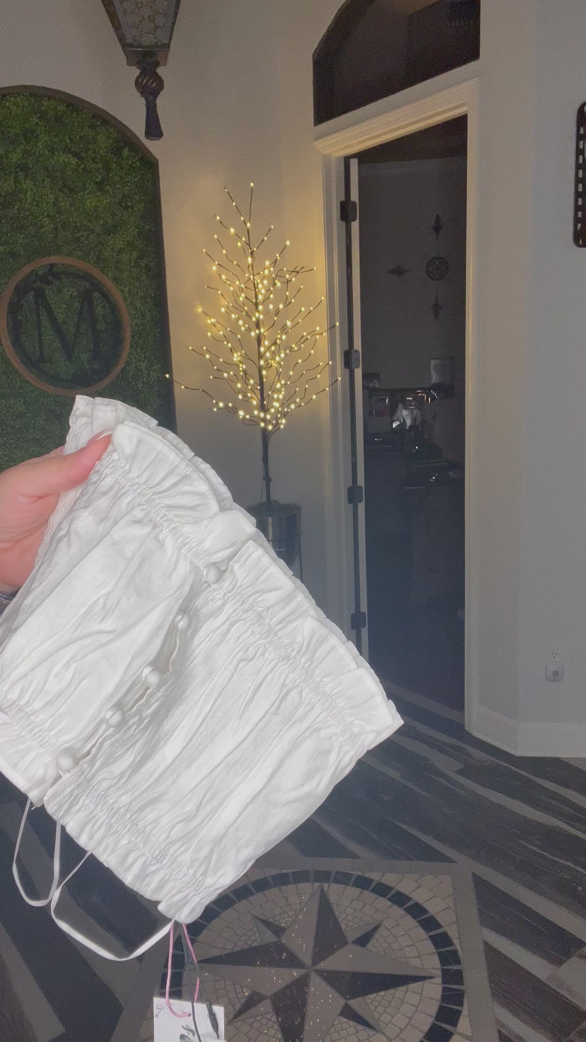 This strapless, cropped top comes in a linen white color with front buttons and medium stretch. The top features a ruffled design on both the top and bottom, making it a stylish and comfortable choice.