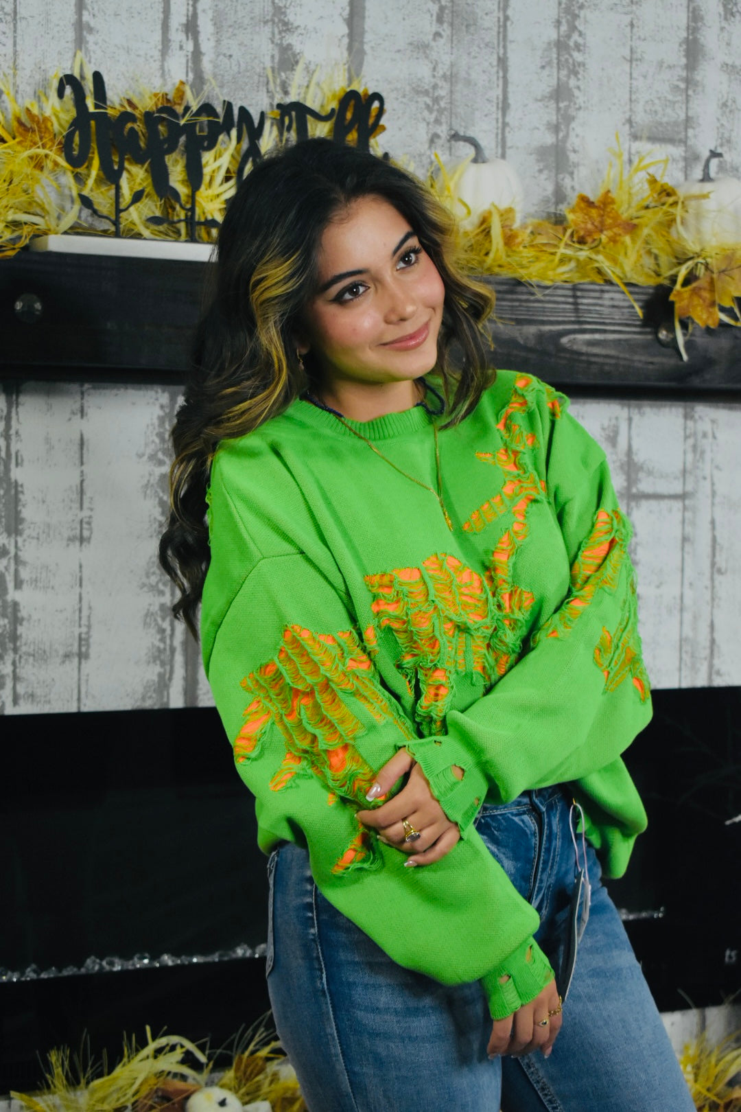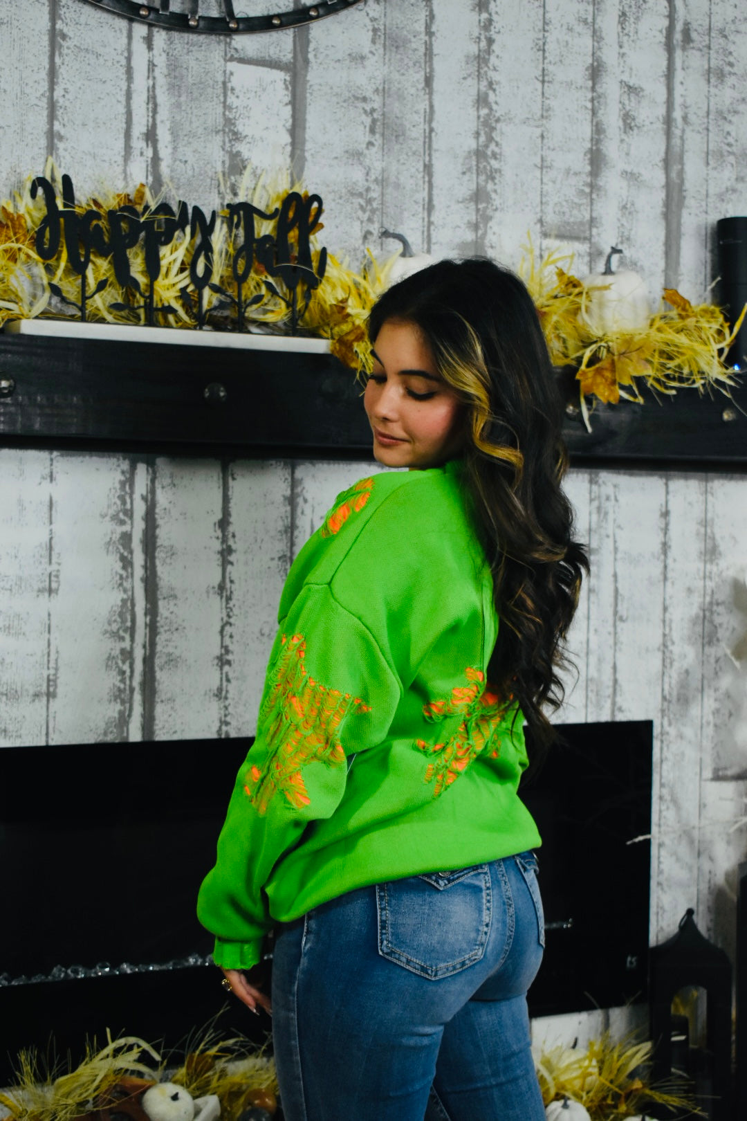 This garment features a long-sleeved design and is oversized for a comfortable fit. Its vibrant lime green color is offset by an orange underlining, creating a bold and eye-catching contrast. Additionally, it is made from a double knit fabric, ensuring maximum durability and warmth.