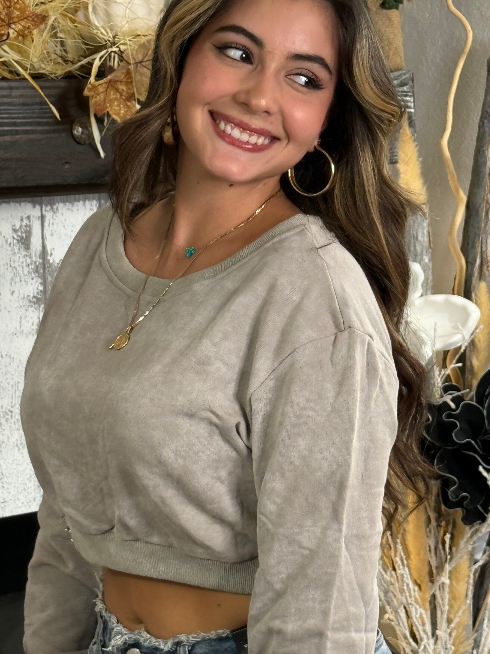 The Me Cropped sweatshirt top features a washed beige color and an ME logo adorned with rhinestones, all encircled by an elastic waist band.