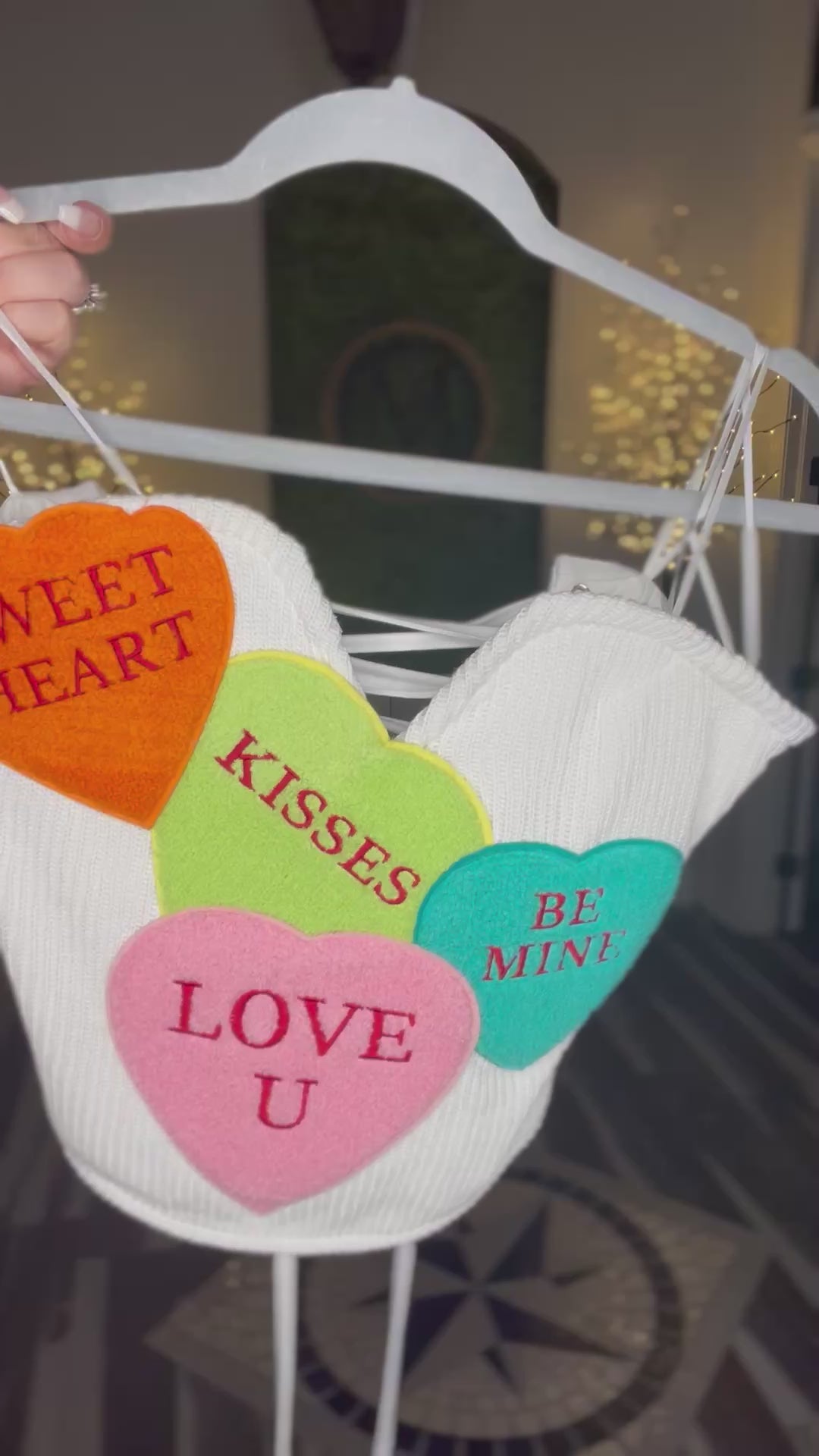 This top features a knitted corset style with a white background and colored hearts, and is tied together with lace in the back.