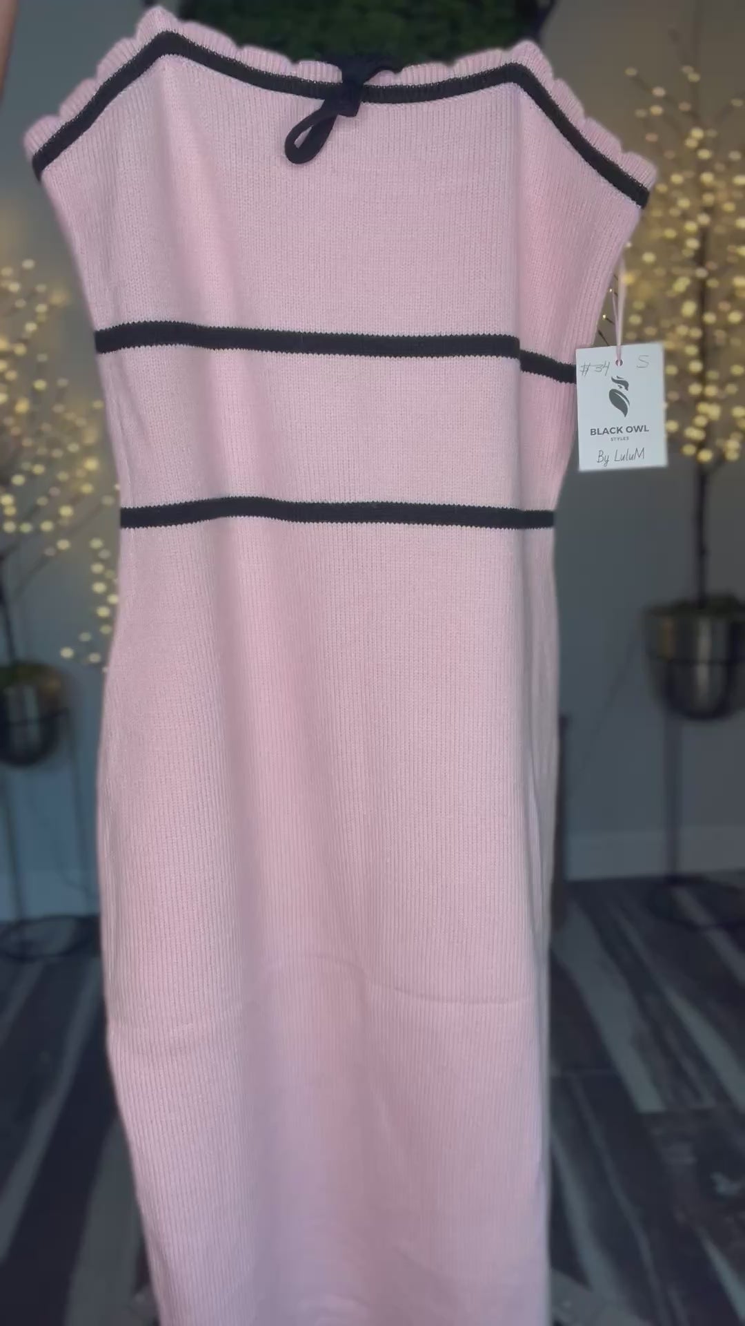 The Pink Elegance Knit Dress features a moderate level of stretch, perfect for comfortable wear. The dress also includes elegant accents and a bow in a classic black knit fabric.