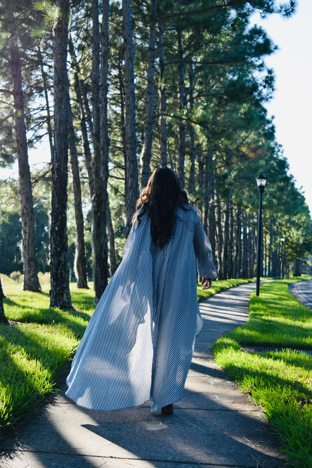 This blouse features a double ruffle in the front, adding a touch of elegance to the classic striped chiffon material. The button-up design is cropped in the front and the long sleeves are gathered with an elastic risk band. The back flows like a long cape, giving the top a unique and stylish look.