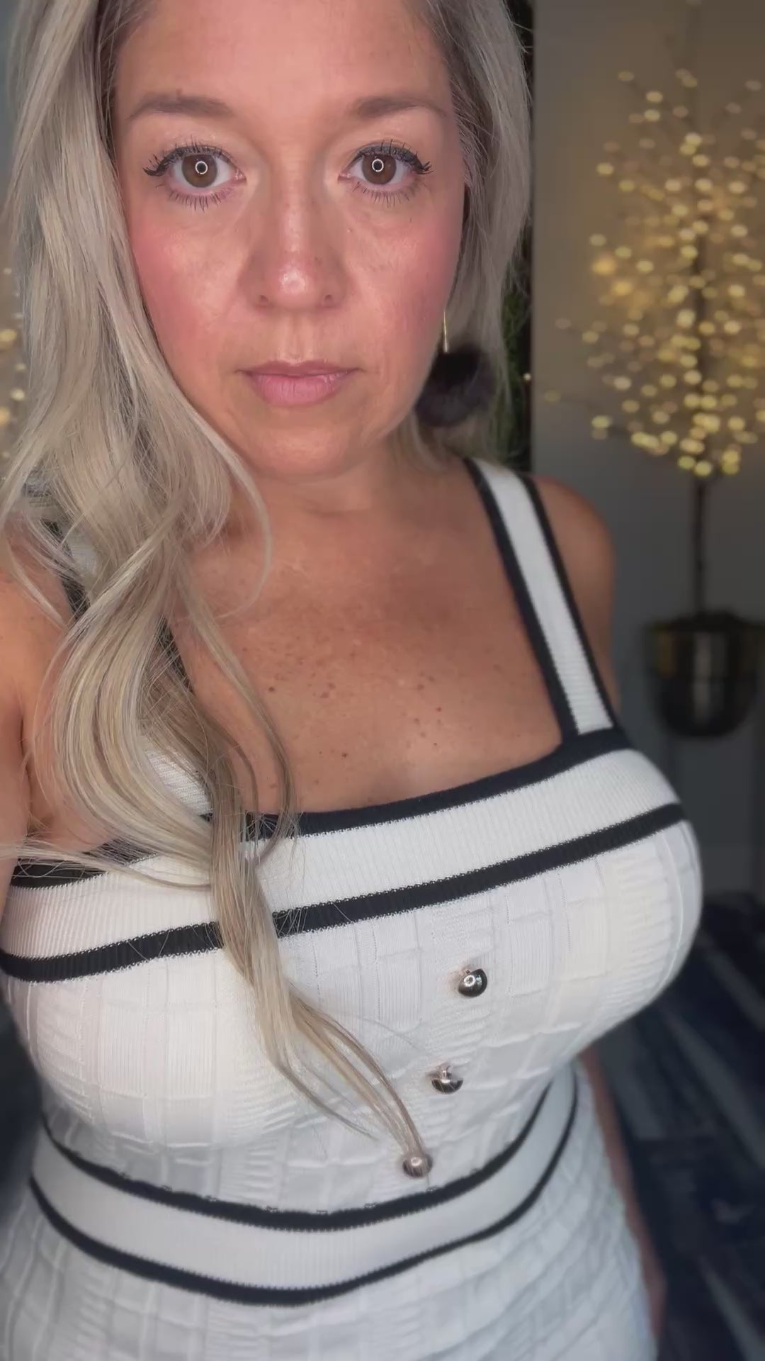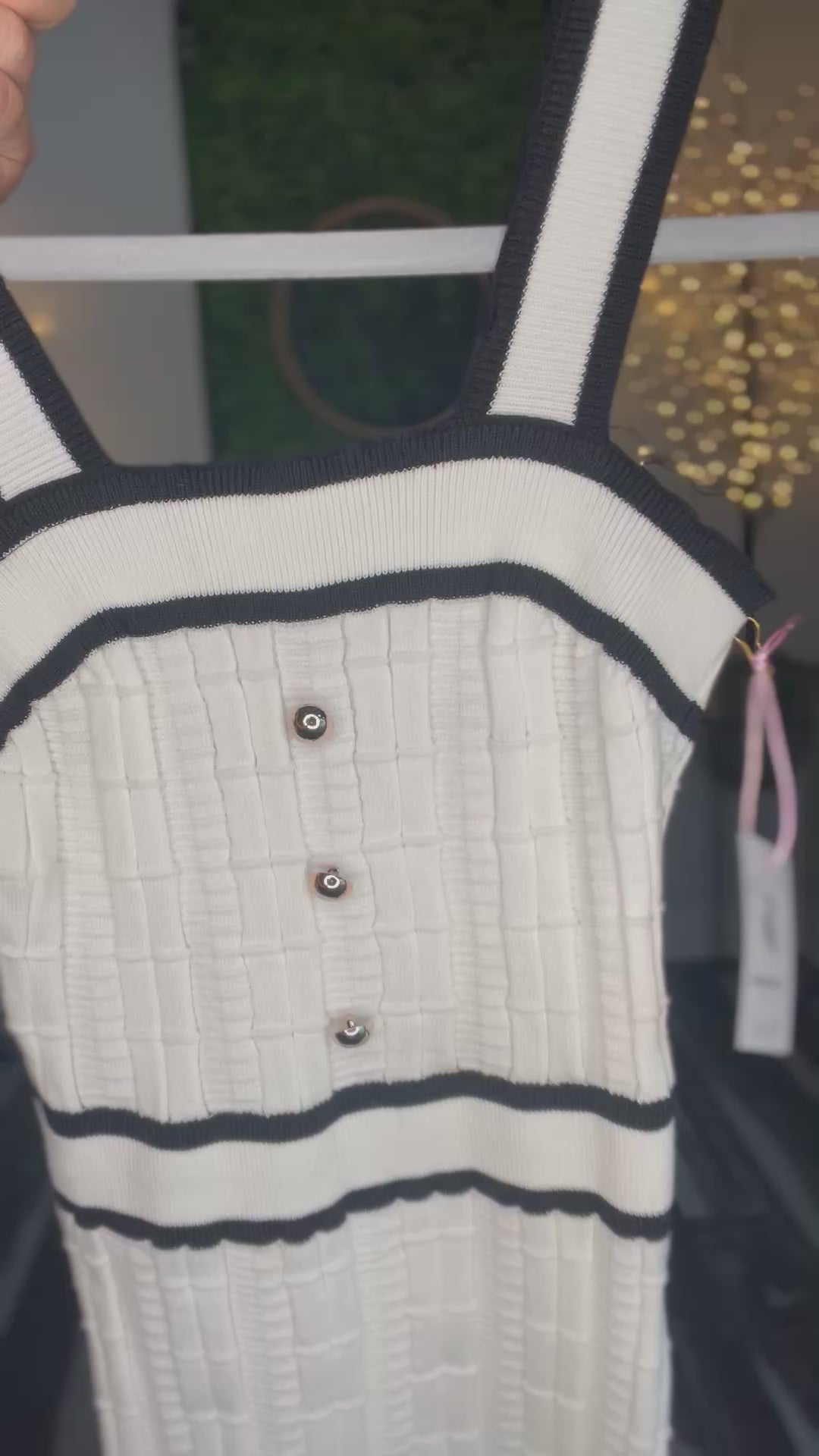 This White Elegance Knitted Mini Dress has wide straps and is designed with medium stretch for a comfortable fit. The dress features sophisticated gold front buttons and is accented with black edges for a stylish touch.
